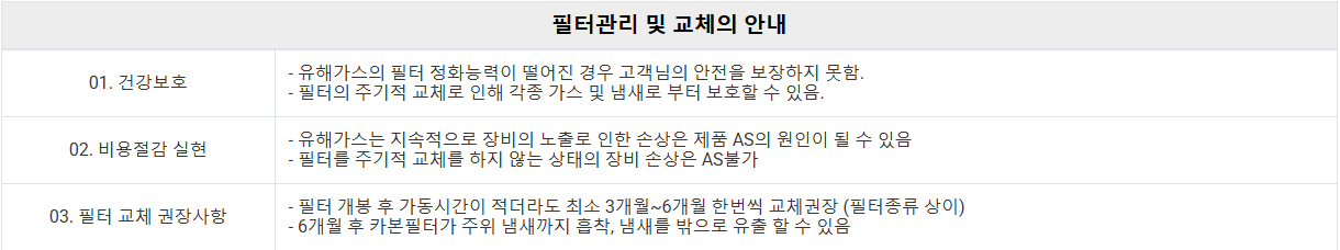 프리필터(교체주기 30일), 헤파필터(교체주기 60일), 메인필터(교체주기 120일)