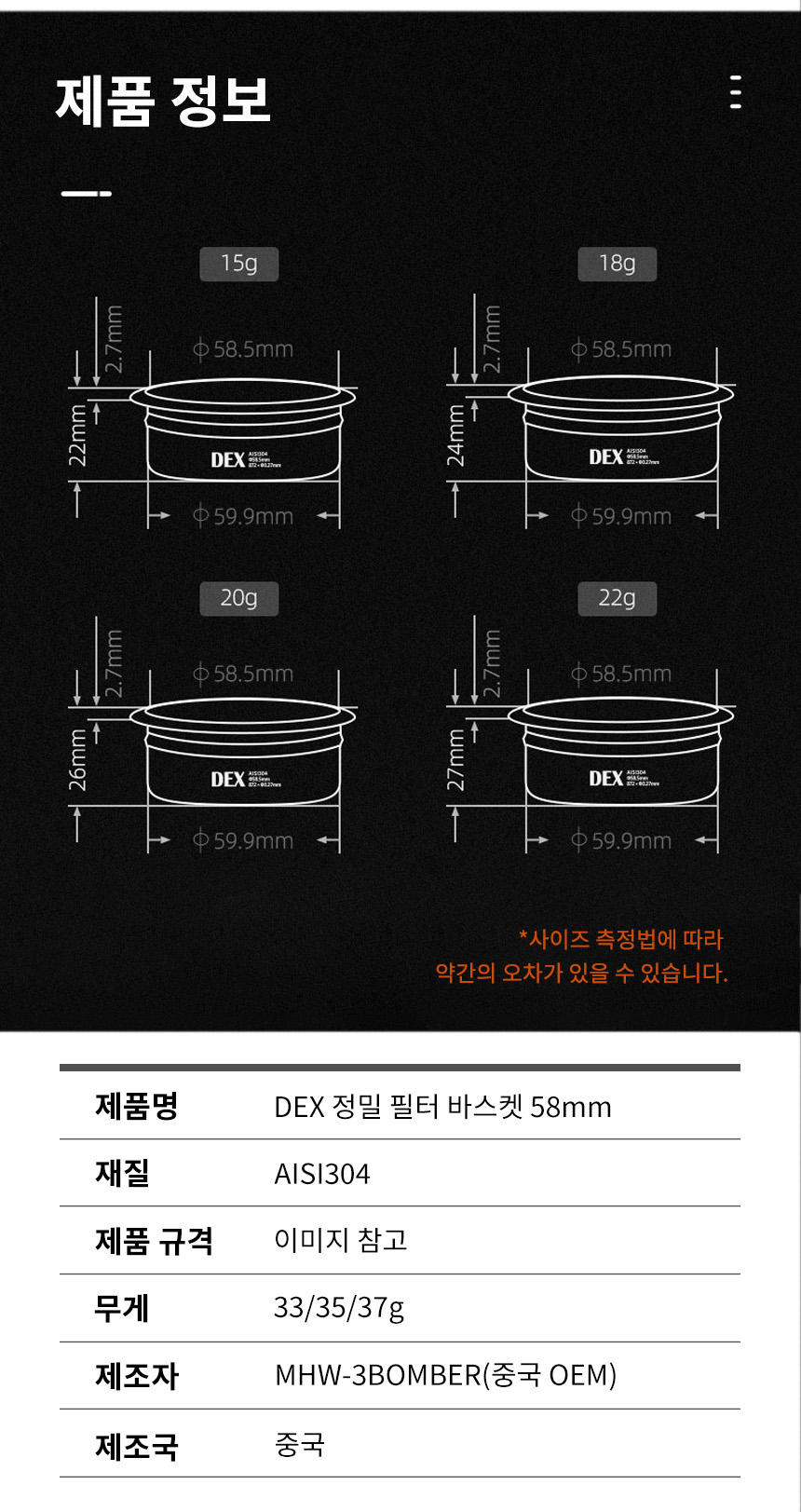 쓰리바머 DEX 정밀 필터 바스켓 58.5mm - 18g 20g 22g