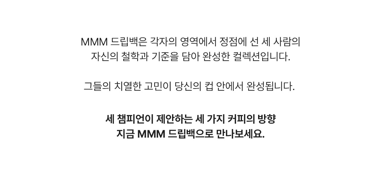 각자의 영역에서 정점에 선 세 챔피언이 선택한 커피 중 하나를 단품으로 담았습니다.