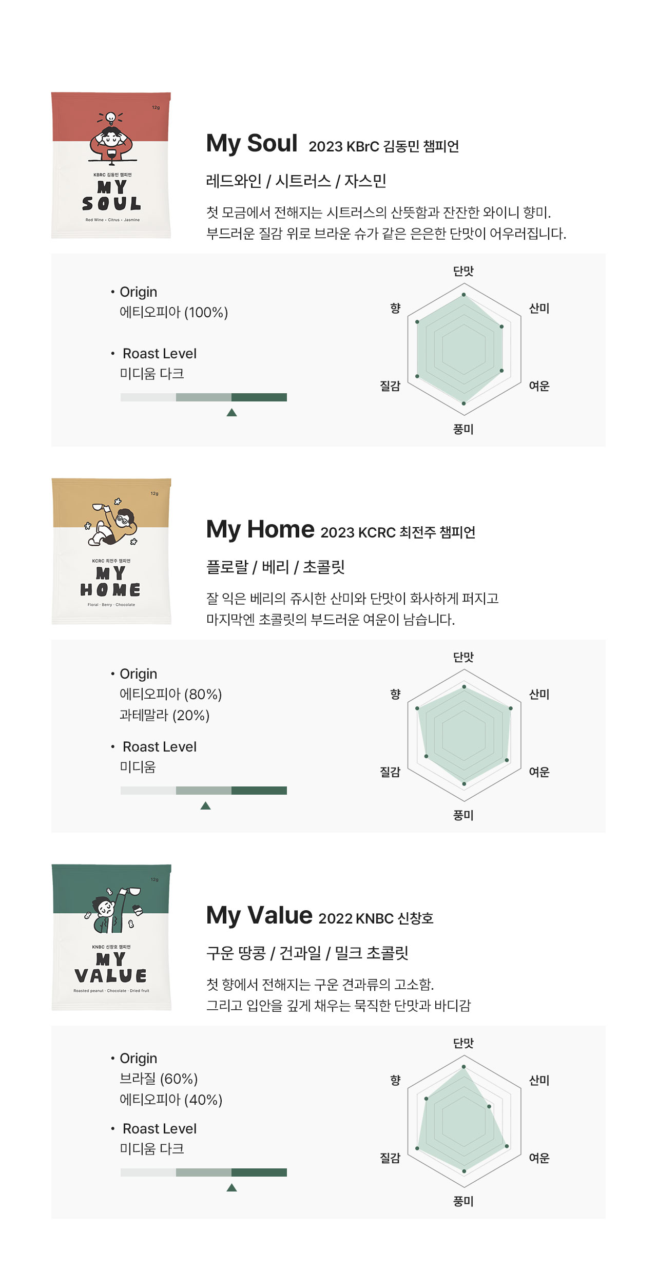 각자의 영역에서 정점에 선 세 챔피언이 선택한 커피 중 하나를 단품으로 담았습니다.